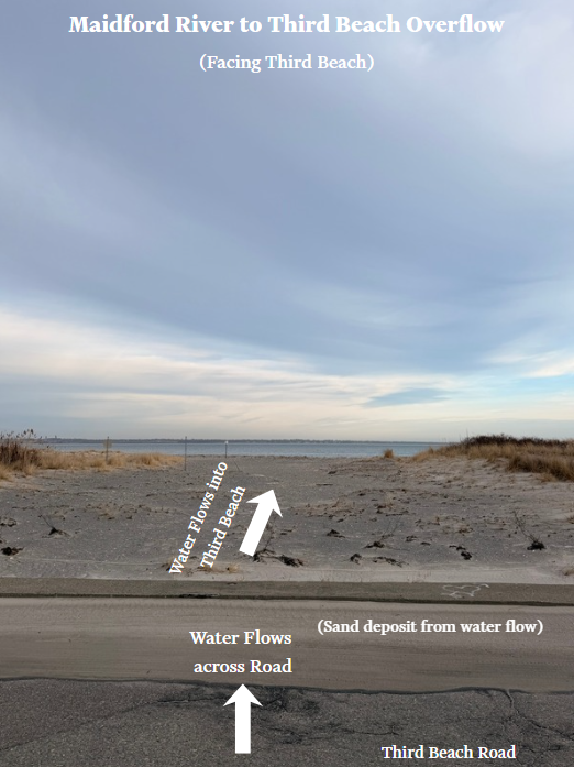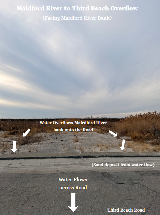 Site Description: This area often experiences flooding during heavy rainstorms. The water overflows the bank of the Maidford river, runs over Third Beach Road onto Third Beach, and enters the bay. Your uploaded videos and photos will assist with future planning for better stormwater management.